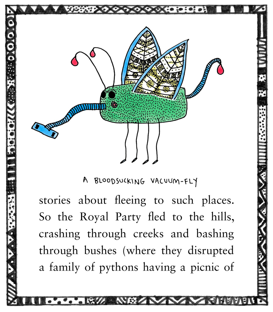 “We must flee to the hills!” cried the Footman, who as well as honing his reflexes at cards had read a lot of exciting stories about fleeing to such places. So the Royal Party fled to the hills, crashing through creeks and bashing through bushes (where they disrupted a family of pythons having a picnic of their own) before stumbling into the cave, many of them still clutching half-eaten cream buns.