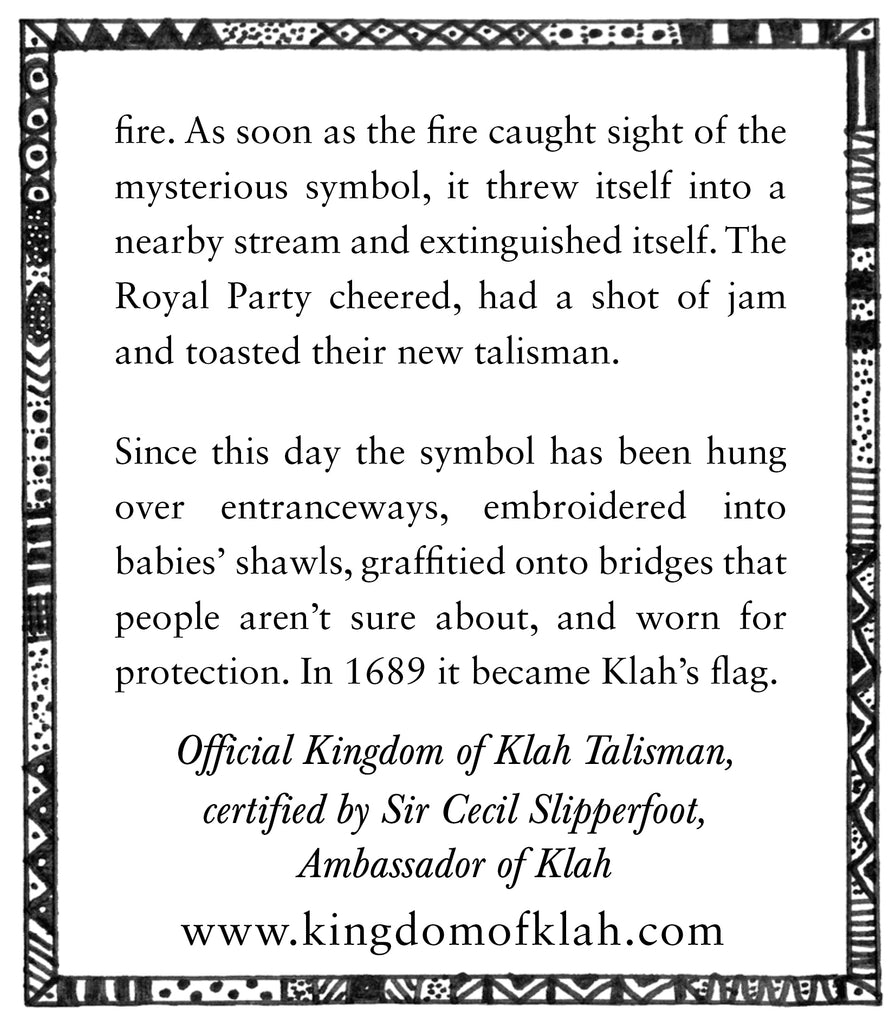 Since this day the symbol has been hung over entranceways, embroidered into babies’ shawls, graffitied onto bridges that people aren’t sure about, and worn for protection. In 1689 it became Klah’s flag.