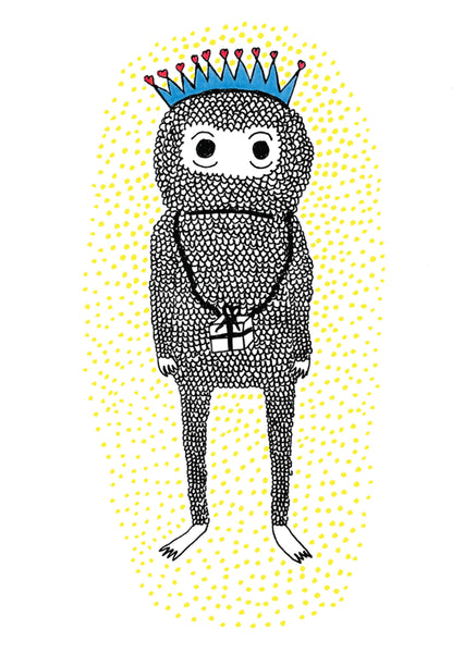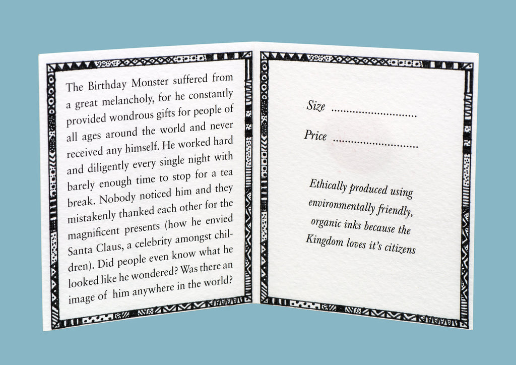 The Birthday Monster suffered from a great melancholy, for he constantly provided wondrous gifts for people of all ages around the world and never received any himself. He worked hard and diligently every single night with barely time to stop for a tea break. Nobody noticed him and they mistakenly thanked each other for the magnificent presents (how he envied Santa Claus, a celebrity amongst children). Did people even know what he looked like he wondered? Was there an image of him anywhere in the world?