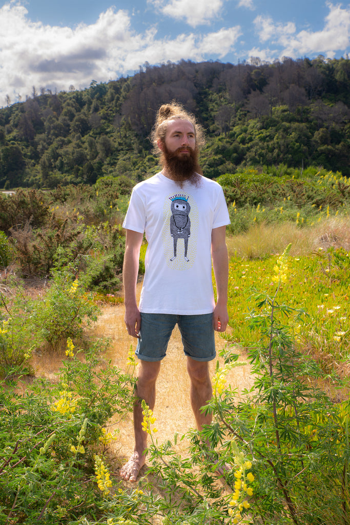 100% cotton t-shirt (180 GSM), produced under ethical working conditions and hand-printed in New Zealand using environmentally friendly, organic inks.