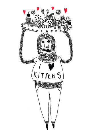 Raymond had always been terrified of kittens. His elbows shook with fear when he heard the sound of meowing, his hands became clammy at the thought of their whiskers, and several times he jumped into the arms of unsuspecting strangers when he encountered cats in the street. He had nightmares about thousands of kittens holding paws and singing songs about rainbows. One day he met the girl of his dreams, Ramona R. Ramspittle. Ramona had magnificently silky eyebrows and an equal fondness for badminton. Raymond daydreamed about the two of them in matching badminton costumes, leaping around with tiny racquets and tremendous agility, sparks flying in the air and her eyebrows flowing in the wind. Unfortunately, Ramona also had an intense love of cats: her house was shaped like an enormous cats head and her mantlepiece adorned with miniature cat statues. Raymond wanted to impress her. He dismantled his cat alarms and adorned himself with happy cat paraphernalia. They went to the park and held hands. He disguised his terror with large volumes of catnip, but in the back of his mind he worried, “how long before she knows?”