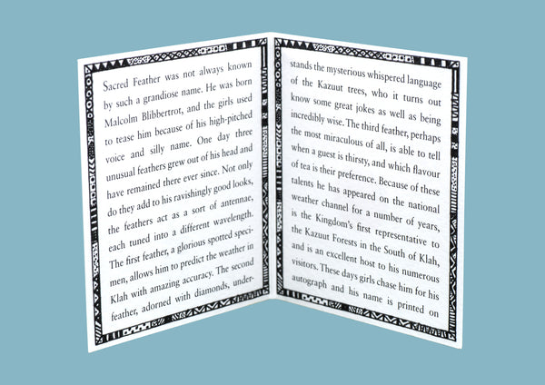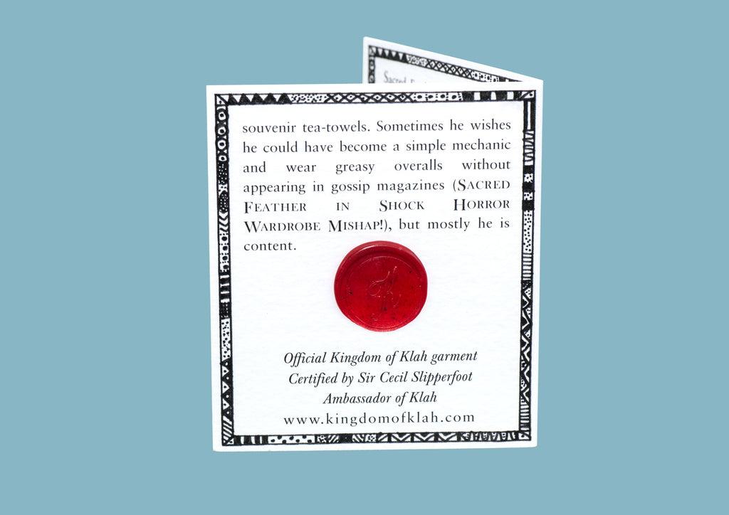 ✦ Sacred Feather was not always known by such a grandiose name. He was born Malcolm Blibbertrot, and the girls used to tease him because of his high-pitched voice and silly name. One day three unusual feathers grew out of his head and have remained there ever since. Not only do they add to his ravishingly good looks, the feathers act as a sort of antennae, each tuned into a different wavelength. The first feather, a glorious spotted specimen, allows him to predict the weather in Klah with amazing accuracy. The second feather, adorned with diamonds, understands the mysterious whispered language of the Kazuut trees, who it turns out know some great jokes as well as being incredibly wise. The third feather, perhaps the most miraculous of all, is able to tell when a guest is thirsty, and which flavour of tea is their preference. Because of these talents he has appeared on the national weather channel for a number of years, is the Kingdom’s first representative to the Kazuut Forests in the South of Klah, and is an excellent host to his numerous visitors. These days girls chase him for his autograph and his name is printed on souvenir tea-towels. Sometimes he wishes he could have become a simple mechanic and wear greasy overalls without appearing in  gossip magazines (SACRED FEATHER IN SHOCK-HORROR WARDROBE MISHAP!), but mostly he is content. ✦