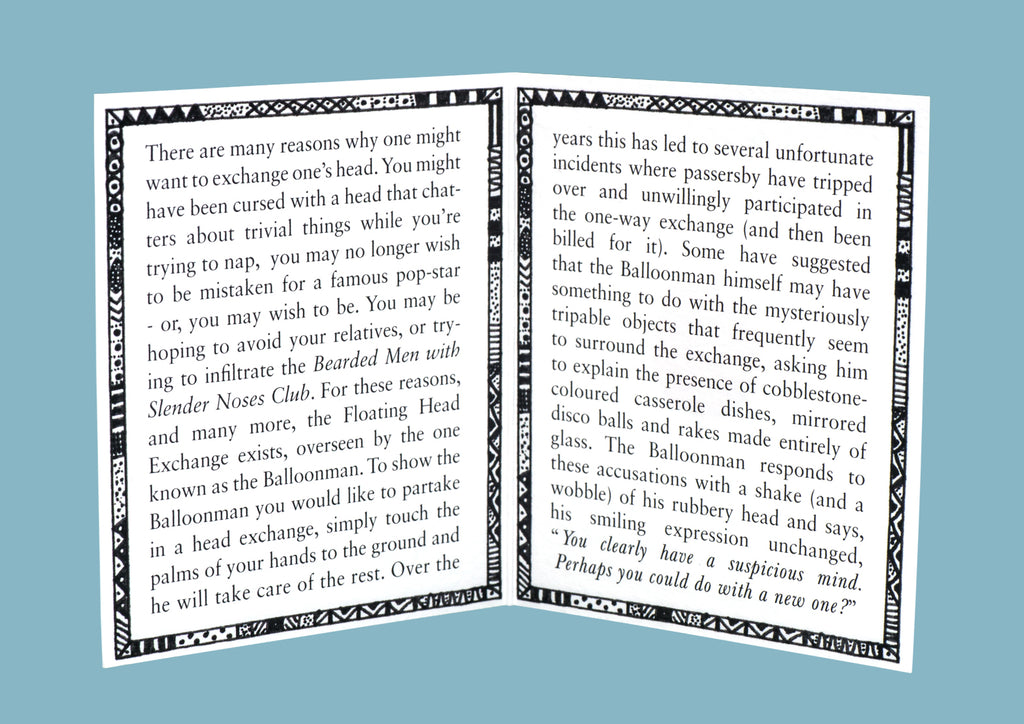 ✦ There are many reasons why one might want to exchange one's head. You might have been cursed with a head that chatters about trivial things while you’re trying to nap, you may no longer wish to be mistaken for a famous pop-star - or, you may wish to be. You may be hoping to avoid your relatives, or trying to infiltrate the Bearded Men with Slender Noses Club. For these reasons, and many more, the Floating Head Exchange exists, overseen by one known as the Balloonman. To show the Balloonman you would like to partake in a head exchange, simply touch the palms of your hands to the ground and he will take care of the rest. Over the years this has led to several unfortunate incidents where passersby have tripped over and unwillingly participated in the one-way exchange (and then been charged for it). Some have suggested that the Balloonman himself may have something to do with the mysteriously trippable objects that frequently seem to surround the exchange, asking him to explain the presence of cobblestone-coloured casserole dishes, mirrored disco balls and rakes made entirely of glass. The Balloonman responds to these accusations with a shake (and a wobble) of his rubbery head and says, his smiling expression unchanged, “You clearly have a suspicious mind. Perhaps you could do with a new one?” ✦
