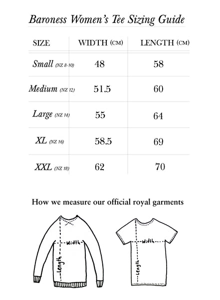 100% cotton t-shirt with rolled sleeves (150 GSM), produced under ethical working conditions and hand-printed in New Zealand using environmentally friendly, organic inks. The Baroness shirts have a relaxed fit.