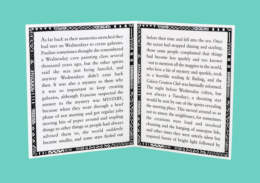 As far back as their memories stretched they had met on Wednesdays to create galaxies. Pauline sometimes thought she remembered a Wednesday cave painting class several thousand years ago, but the other spirits said she was just being fanciful, and anyway Wednesdays didn't exist back then. It was also a mystery to them why it was so important to keep creating galaxies, although Francine suspected the answer to the mystery was MYSTERY, because when they went through a brief phase of not meeting and got regular jobs moving bits of paper around and stapling things to other things as people had always advised them to, the world suddenly became smaller, and some stars fizzled out before their time and fell into the sea. Once the ocean had stopped shining and sizzling, those same people complained that things had become less sparkly and too known - not to mention all the magpies in the world, who love a bit of mystery and sparkle, took to a horrible wailing & flailing, and the Galaxy Creation Club was hurriedly reformed. The night before Wednesday (often, but not always a Tuesday), a shooting star would be sent by one of the spirits revealing the meeting place. This moved around so as not to annoy the neighbours, for sometimes the creations were loud and involved chanting and the banging of saucepan lids, and other times they were utterly silent but required bursts of bright light followed by bursts of dark light, and dark light can be very disconcerting if you aren't accustomed to it. The locations were chosen in turn, because if Pauline had her way they would always be meeting in difficult to reach treehouses, or moonlit swamps which sound romantic but are also prone to vampirish insects, and Gregor found this very distracting while he was in the zone. In the zone they always muttered or sang or yelled or silently thought the ultimate words of creation, the words of their belonging and the binding of all things: KINGDOM OF KLAH ❇︎✺✬