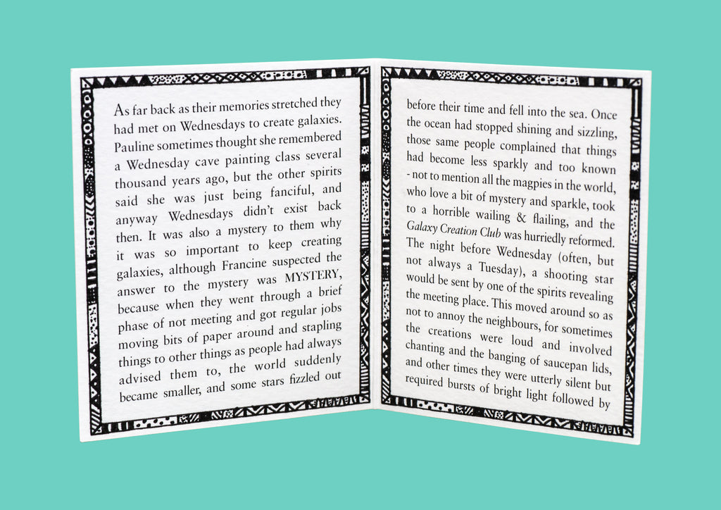 As far back as their memories stretched they had met on Wednesdays to create galaxies. Pauline sometimes thought she remembered a Wednesday cave painting class several thousand years ago, but the other spirits said she was just being fanciful, and anyway Wednesdays didn't exist back then. It was also a mystery to them why it was so important to keep creating galaxies, although Francine suspected the answer to the mystery was MYSTERY, because when they went through a brief phase of not meeting and got regular jobs moving bits of paper around and stapling things to other things as people had always advised them to, the world suddenly became smaller, and some stars fizzled out before their time and fell into the sea. Once the ocean had stopped shining and sizzling, those same people complained that things had become less sparkly and too known - not to mention all the magpies in the world, who love a bit of mystery and sparkle, took to a horrible wailing & flailing, and the Galaxy Creation Club was hurriedly reformed. The night before Wednesday (often, but not always a Tuesday), a shooting star would be sent by one of the spirits revealing the meeting place. This moved around so as not to annoy the neighbours, for sometimes the creations were loud and involved chanting and the banging of saucepan lids, and other times they were utterly silent but required bursts of bright light followed by bursts of dark light, and dark light can be very disconcerting if you aren't accustomed to it. The locations were chosen in turn, because if Pauline had her way they would always be meeting in difficult to reach treehouses, or moonlit swamps which sound romantic but are also prone to vampirish insects, and Gregor found this very distracting while he was in the zone. In the zone they always muttered or sang or yelled or silently thought the ultimate words of creation, the words of their belonging and the binding of all things: KINGDOM OF KLAH ❇︎✺✬