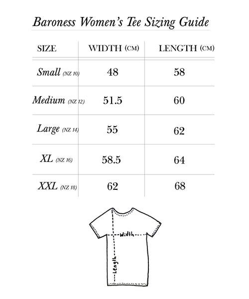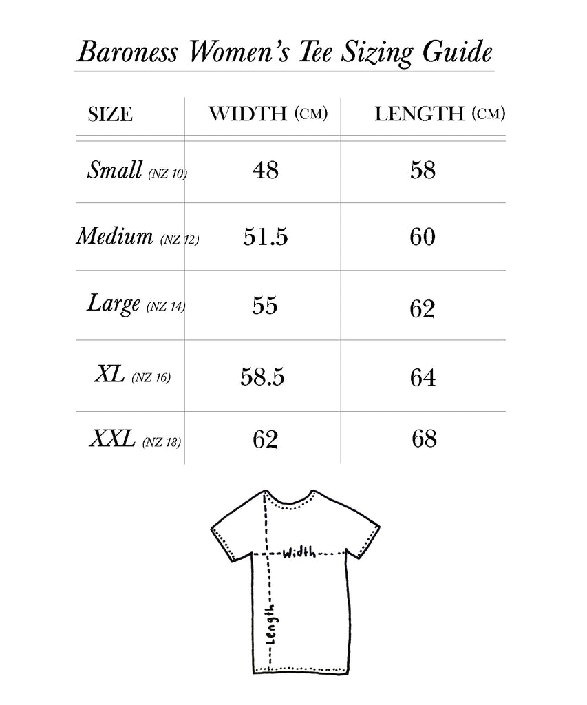 100% cotton t-shirt with rolled sleeves (150 GSM), produced under ethical working conditions and hand-printed in New Zealand using environmentally friendly, organic inks. The Baroness shirts have a relaxed fit. The Empress Sophie is pictured here wearing a size Medium, is 1.84cm tall and a standard size 12. For a sizing guide please see images.