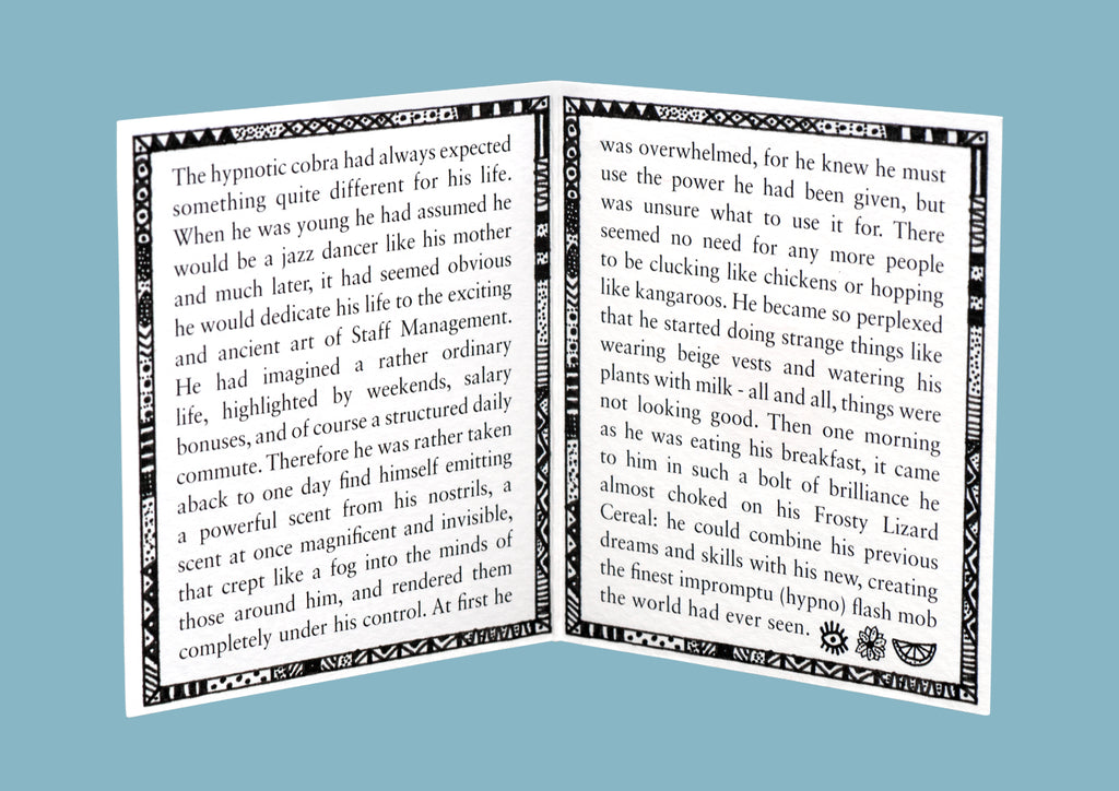 The hypnotic cobra had always expected something quite different for his life. When he was young he had assumed he would be a jazz dancer like his mother and much later, it had seemed obvious he would dedicate his life to the exciting and ancient art of Staff Management. He had imagined a rather ordinary life, highlighted by weekends, salary bonuses, and of course a structured daily commute. Therefore he was rather taken aback to one day find himself emitting a powerful scent from his nostrils, a scent at once magnificent and invisible, that crept like a fog into the minds of those around him, and rendered them completely under his control. At first he was overwhelmed, for he knew he must use the power he had been given, but was unsure what to use it for. There seemed no need for more people to be clucking like chickens or hopping like kangaroos. He became so perplexed that he started doing strange things like wearing beige vests and watering his plants with milk - all and all, things were not looking good. Then one morning as he was eating his breakfast, it came to him in such a bolt of brilliance he almost choked on his Frosty Lizard Cereal: he could combine his previous dreams and skills with his new, creating the finest impromptu (hypno) flash mob the world had ever seen.