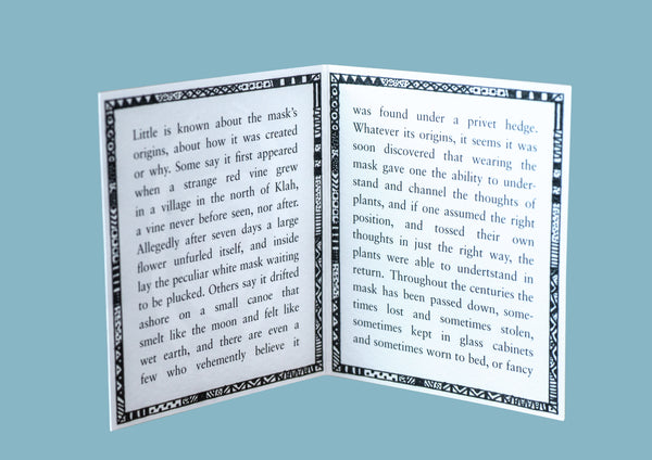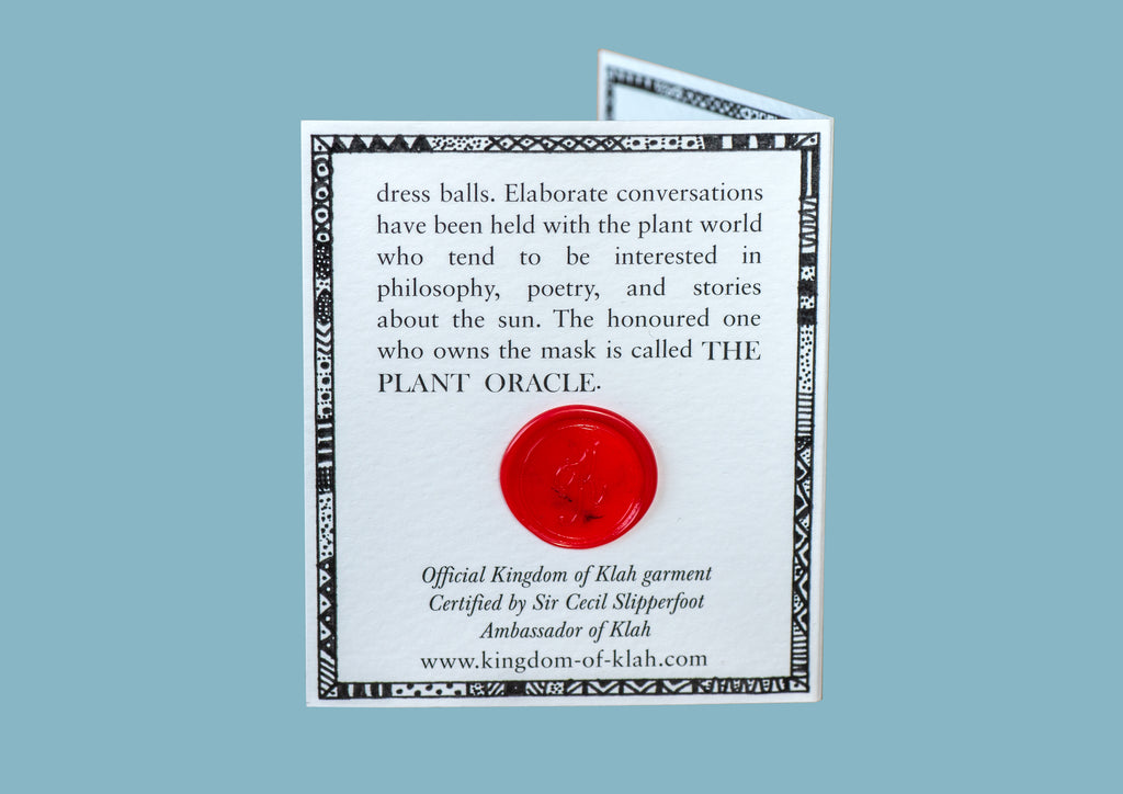 Little is known about the mask’s origins, about how it was created or why. Some say it first appeared when a strange red vine grew in a village in the north of Klah, a vine never before seen, nor after. Allegedly after seven days a large flower unfurled itself and inside lay the peculiar white mask waiting to be plucked. Others say it drifted ashore on a small canoe that smelt like the moon and felt like wet earth, and there are even a few who vehemently believe it was found under a privet hedge. Whatever its origins, it seems it was soon discovered that wearing the mask gave one the ability to understand and channel the thoughts of plants, and if one assumed the right position, and tossed their own thoughts in just the right way, the plants were able to understand in return. Throughout the centuries the mask has been passed down, sometimes lost and sometimes stolen, sometimes kept in glass cabinets and sometimes worn to bed, or fancy dress balls. Elaborate conversations have been held with the plant world, who tend to be interested in philosophy, poetry, and stories about the sun. The honoured one who owns the mask is called THE PLANT ORACLE.
