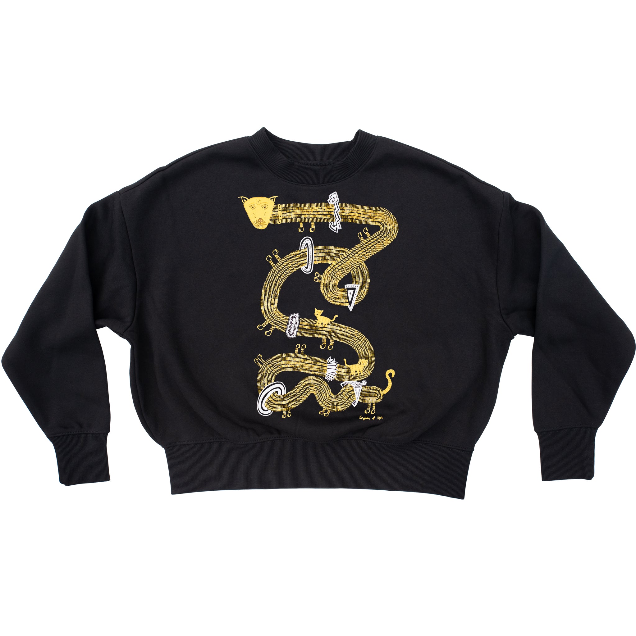 Handprinted sweatshirt (400 GSM cotton, CVC fleece lining) with neck and sleeve cuff ribbing, a relaxed / oversized fit and dropped shoulders. This garment is produced under ethical working conditions and screenprinted by Klah's Royal Master Artist using environmentally friendly, organic inks.