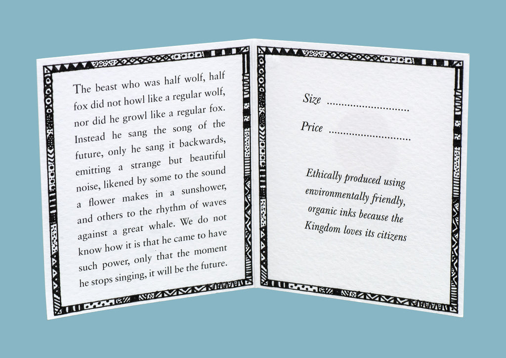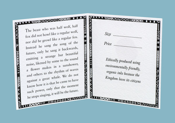 The beast who was half wolf, half fox did not howl like a regular wolf, nor did he growl like a regular fox. Instead he sang the song of the future, only he sang it backwards, emitting a strange but beautiful noise, likened by some to the sound a flower makes in a sunshower, and others to the rhythm of waves against a great whale. We do not know how it is that he came to have such power, only that the moment he stops singing, it will be the future.